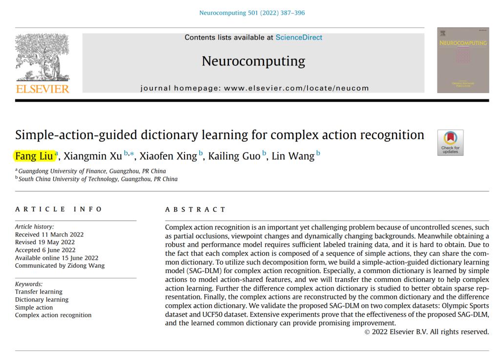 劉芳老師的論文提出了一個簡單動作引導(dǎo)字典學(xué)習(xí)的模型用來識別復(fù)雜的動作,通過共同字典和差異性復(fù)雜動作字典來重建復(fù)雜動作。所提出的算法在兩個復(fù)雜動作數(shù)據(jù)集:Olympic Sports數(shù)據(jù)集和UCF50數(shù)據(jù)集進(jìn)行了驗(yàn)證。實(shí)驗(yàn)結(jié)果表明了所提出的模型是一個有效方法,以及學(xué)習(xí)的共同字典可以提供有益的幫助。該成果發(fā)表在JCR一區(qū)Top期刊《Neurocomputing》(vol. 501, pp. 387-396, 2022)上。